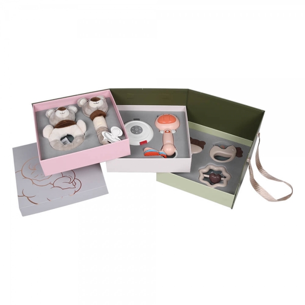 Το σετ διαθέτει λάμπα νυκτός, μασητικά και κουδουνίστρες (μαλακές και μη), καθώς και μια κουδουνίστρα με δυνατότητα να κρεμάσετε τη πιπίλα του μωρού σας. Όλα είναι κατασκευασμένα από υψηλής ποιότητας υλικά, μη τοξικά.